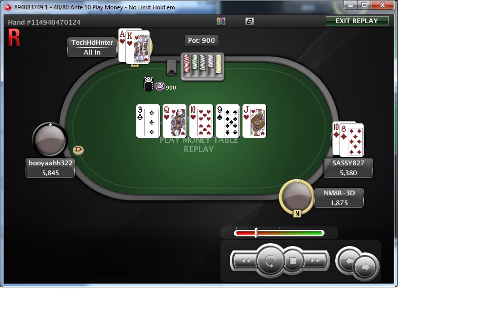 TopEight players this week! Jon was still playing from France. We lost two before the first break. We were down to 4 players by the one-hour mark. 13 minutes later we were down to 3. Bruce had a HUGE lead with 8,599. I was second with 5,270 and Marv was in third with 2,131. Now much had changed by the second break, Bruce still lead with 10,279. I was still second with 3,740 and Marv held third with 1,981. 20 minutes later things had REALLY changed. Bruce was out, Marv had taken the lead with 8,873 and I was still in it with 7,127. At the 2-hour mark, Marv still had a good lead with 8,836. I was hanging in there with 7,164. 20 minutes after that it was over. I had come back and managed to win a long heads-up battle to take my first win in a while.